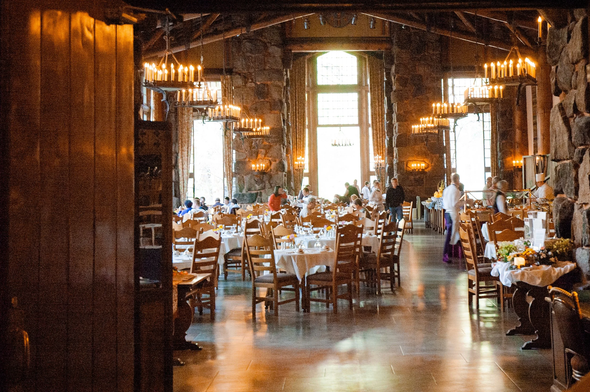 THE RUSTIC NATURE OF THE GRAND DINING ROOM IS EXPECTED AFTER SEEING THE EXTERIOR OF THE AHWAHNEE. IT IS QUITE THE EXPERIENCE TO LOOK AROUND AND THINK OF WHAT IT WAS LIKE FOR THE EARLY TRAVELERS OF THE LATE 1920S.